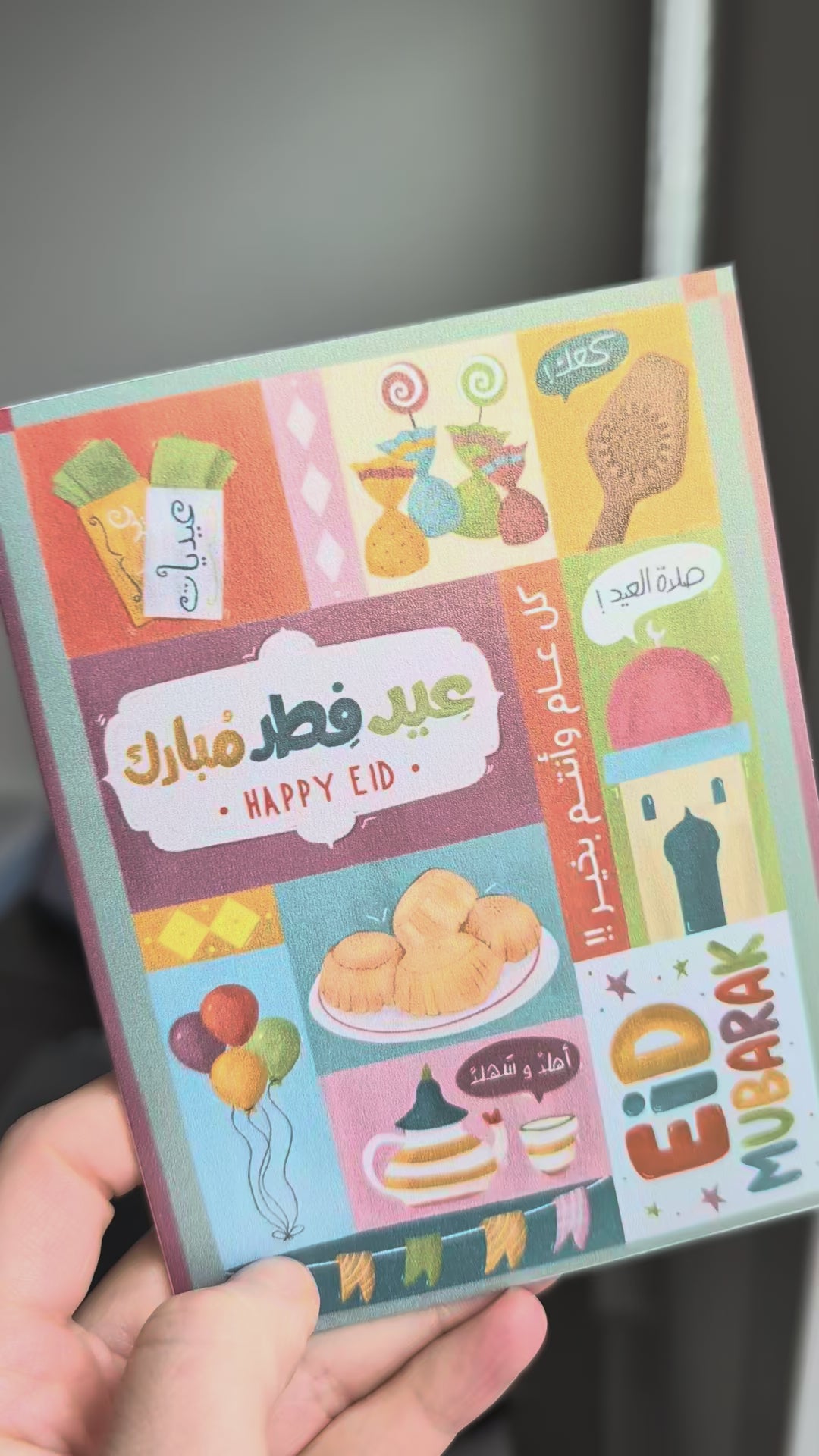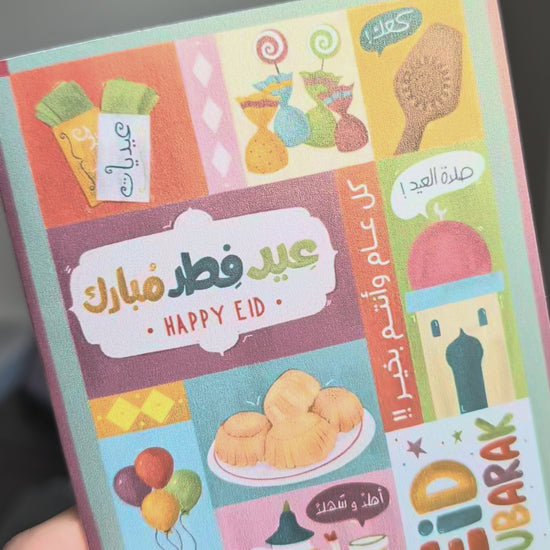 A colorful, lightly shimmery card to celebrate Eid Al-Fitr. The Eid Mubarak greeting card features illustrations inspired by the traditions, sights, and memories of Eid from our childhood. Perfect for gifting, sharing with loved ones, or adding to a Eid basket to make the holiday feel even more meaningful.